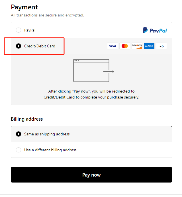 PayPal:You can opt for the swift and hassle-free PayPal payment method. Simply click to connect your existing PayPal account and initiate the payment. This streamlined process ensures a quick and efficient transaction, enhancing your overall shopping experience. |